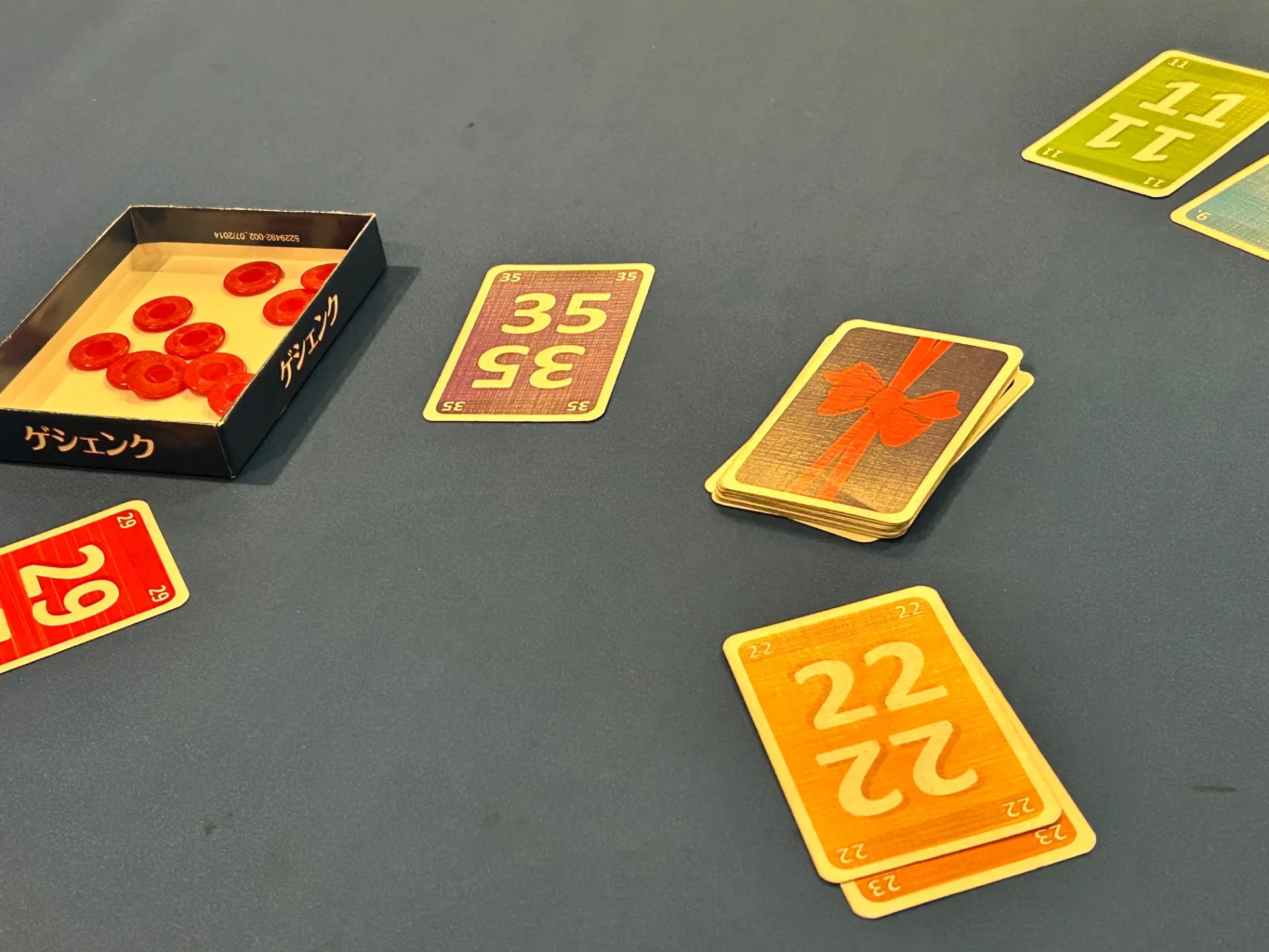 『ゲシェンク(Geschenkt)』は、ドイツ語で「贈り物」という意味を持つ、シンプルながら読み合いと心理戦が楽しめるカードゲームです。