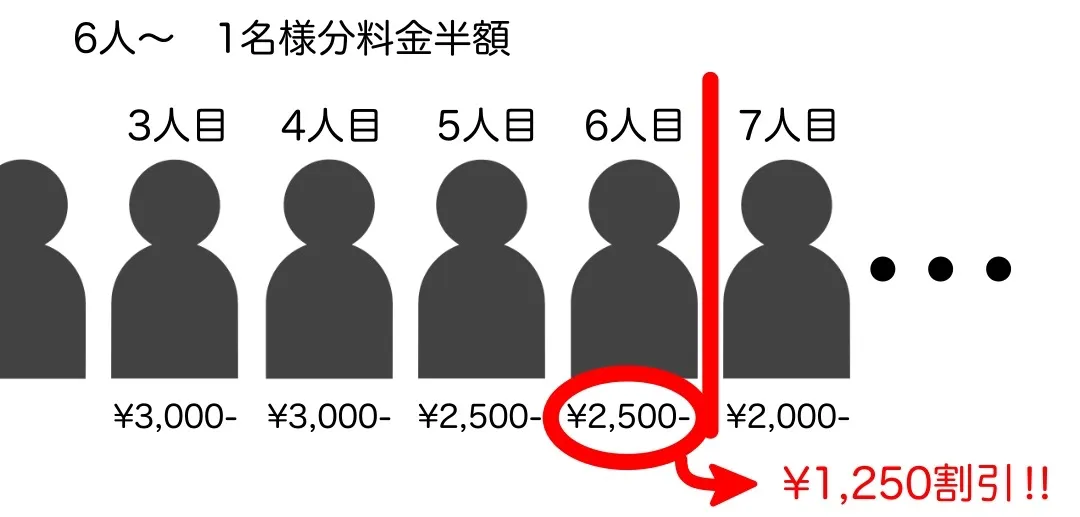 6名様以上でのご利用:1名様分の料金の半額分の割引