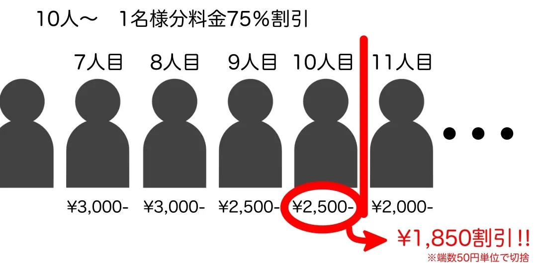 10名様以上でのご利用:1名様分の料金の75%分の割引