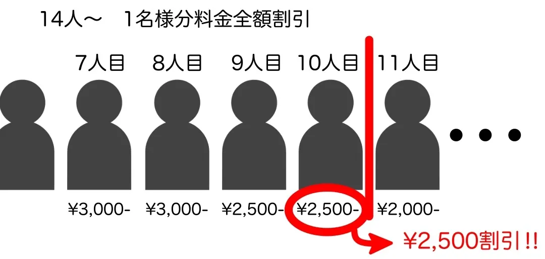 14名様以上でのご利用:1名様分の料金の全額分の割引