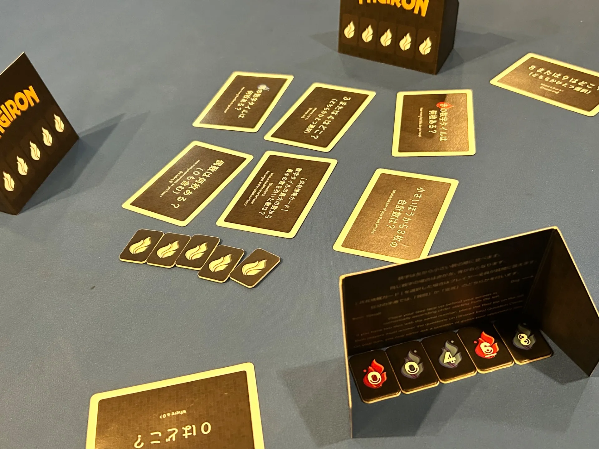 お互いに配られたカードの並びを当て合うのが目的で、自分の番ごとに質問をして情報を引き出していきます。