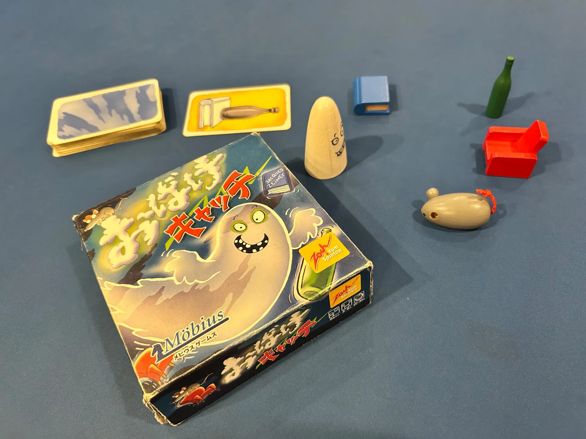 おばけキャッチは、カードと5種類のコマ(おばけ・本・椅子・ねずみ・ビン)を使って遊ぶゲームです。